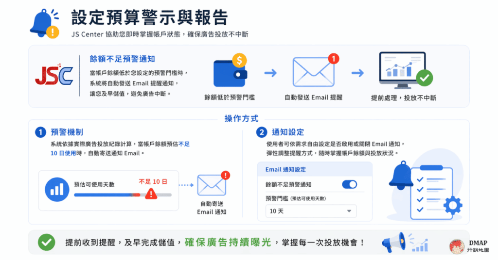 為避免廣告因帳戶餘額不足而中斷投放,JS Center 提供「餘額不足預警通知」功能,協助使用者即時掌握帳戶狀態,提前完成儲值補充,確保廣告投放不中斷。當帳戶餘額低於使用者設定的預警門檻時,系統將 自動發送Email提醒通知,讓您在廣告中斷前即時處理,避免錯失重要曝光與投放時機。