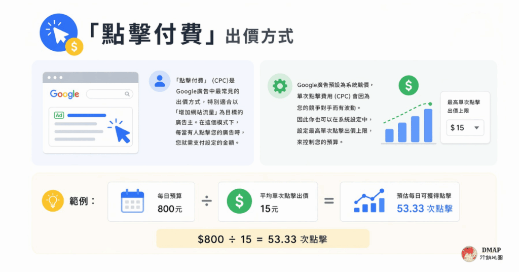 「點擊付費」(CPC)是Google廣告中最常見的出價方式,特別適合以「增加網站流量」為目標的廣告主。在這個模式下,每當有人點擊您的廣告時,您就需支付設定的金額。