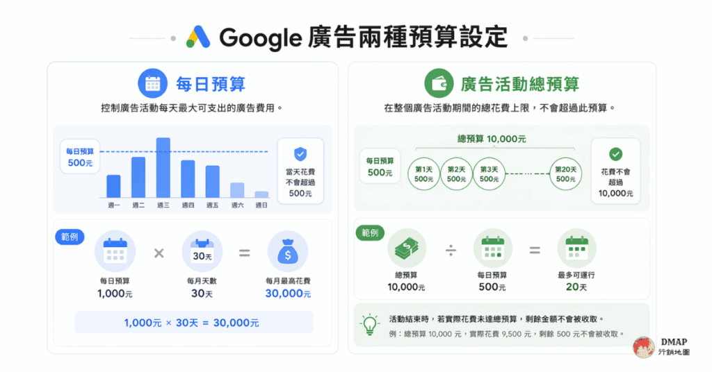Google廣告提供兩種預算設定:「每日預算」和「廣告活動總預算」。