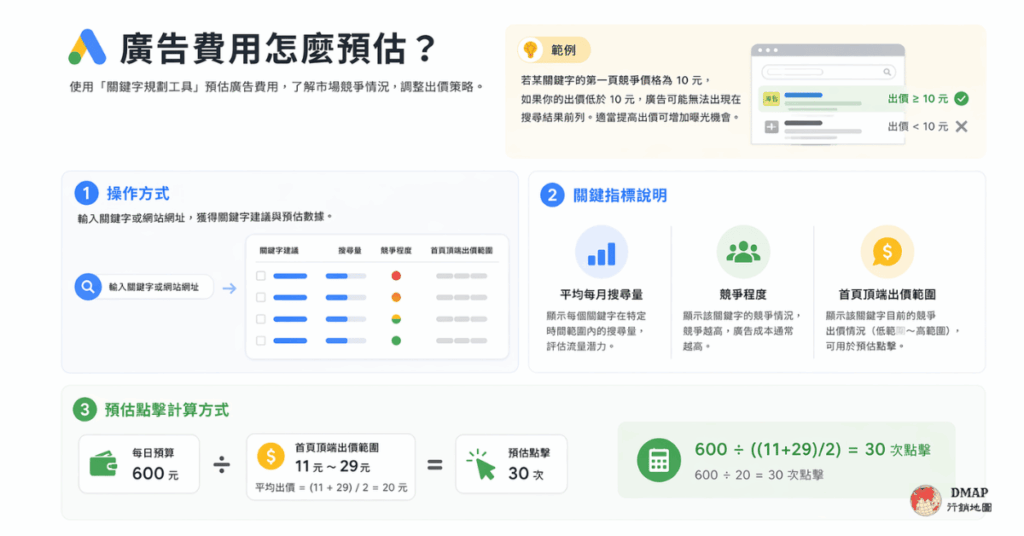 - 首頁頂端出價範圍:這是該關鍵字目前的競爭出價情況,通常分為低範圍和高範圍。根據這個建議範圍,您可以透過每日預算來預估點擊。